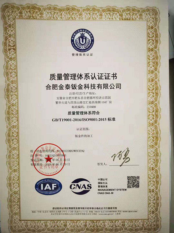 合肥金泰鈑金科技有限公司,專業從事精密鈑金件加工的新技術股份制企業,主要承接各類鈑金加工、激光切割、沖壓件、機箱機柜、設備外殼、不銹鋼產品的精密鈑金加工制作。
